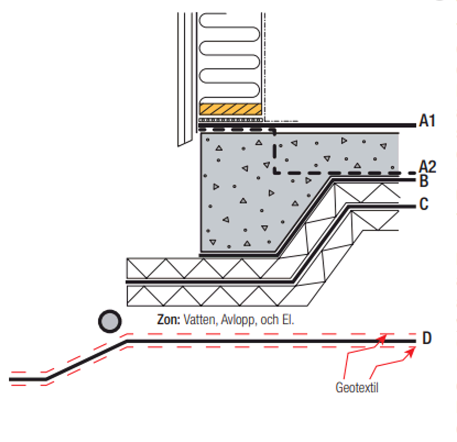 Underlaget skall vara stabilt, slätt och fritt från vassare föremål eller organiska rester. För montering enligt alternativ D. krävs att schaktbotten är avjämnad, stabiliserad och utförd så att vattenavrinningen är säkerställd från membranet till mark utanför grundens