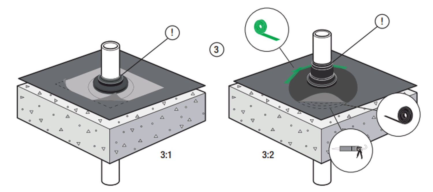 Tätningar vid runda genomförningar utföres enklast i systemet med tillhörande stosar. Stosen kommer att överlappa håltagningen i membranet och bilda en tät anslutning mot röret eller slangen. Gummistos försedd med självklistrande undersida av butylhäftämne (enl. 3:1) finns i olika standarddiametrar. Frigör skyddspappret under stosen. Tryck ner stosen mot underlaget och fixera stosen med roller. Stos av gummi som ej är självklistrande (enl 3:2) monteras lika men klistras mot underlaget med tillbehör Skarvband butyl eller butylmassa T-Fix i tre strängar med helt förslutna ringar. 3:2 tejpas efter härdning skyddande i ytterkant med Tätningstejp T-Flex.