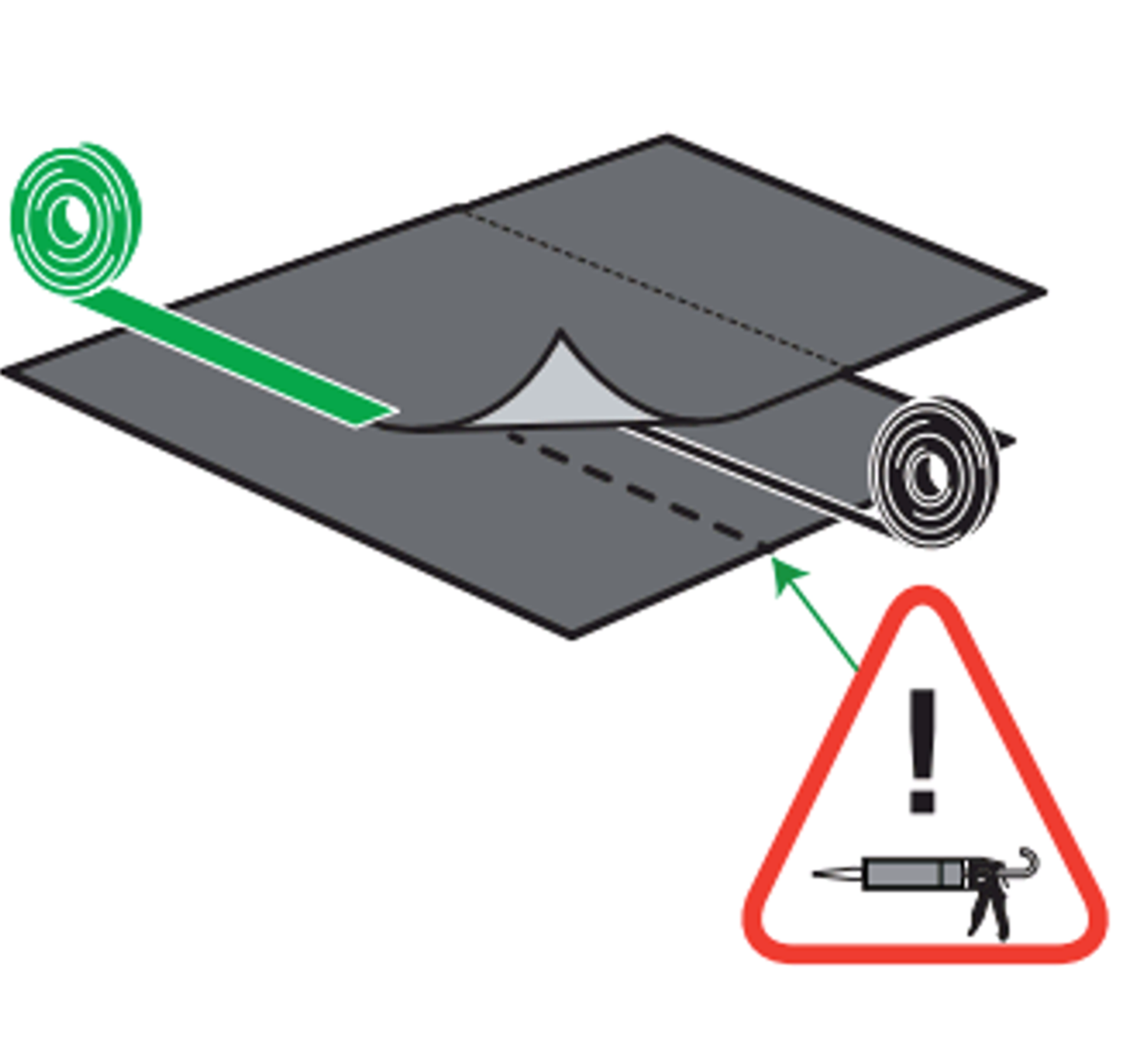 Skarvar i membranet utförs med min 200 mm överlapp med tillhörande försegling. Förseglingen utgörs i systemet av ett dubbelhäftande Skarvband butyl som placeras mitt emellan överlappet. Tryck fast butylbandet mot underlaget med skyddspapper på. Se till att det vidhäftar och frigör sedan detta skyddspapper. Fixera och tryck fast överlappande membrans våd noga.